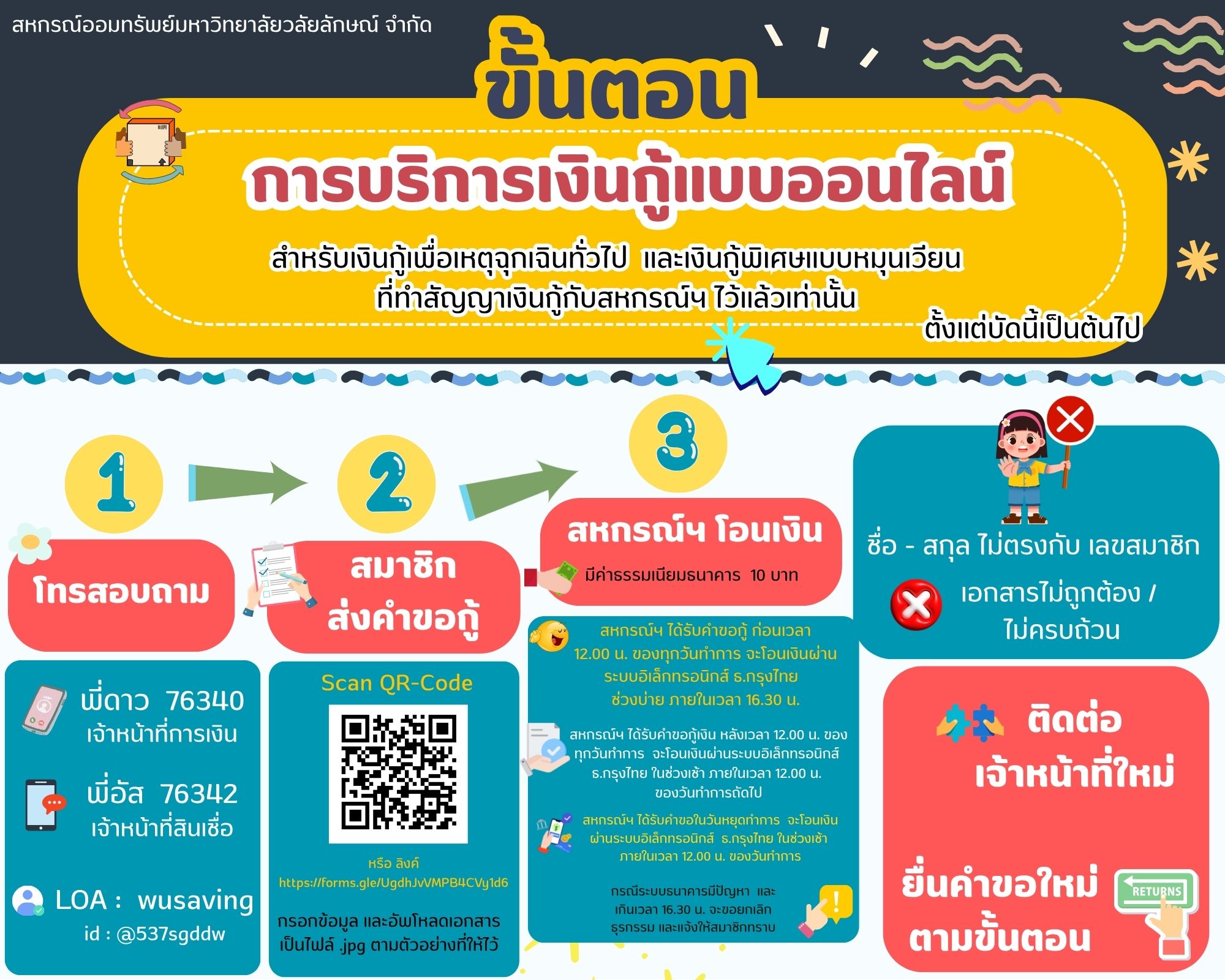 ใช้บริการเงินกู้แบบออนไลน์ ดูรายละเอียดขั้นตอนการบริการ โดยสามารถกดลิงค์ https://forms.gle/UgdhJvVMPB4CVy1d6 หรือ สแกน QR-Code