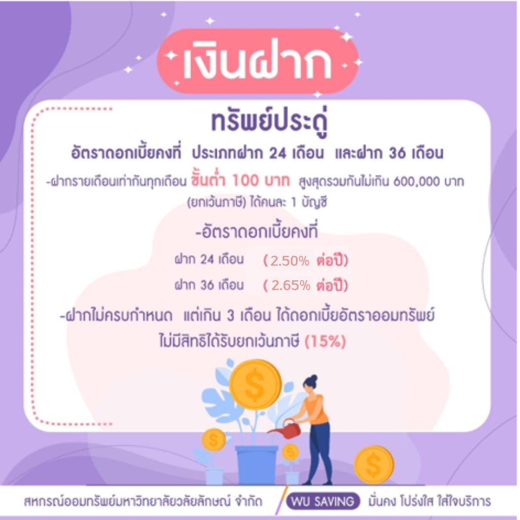– ฝากตามระยะเวลาที่ได้ตกลงไว้กับสหกรณ์ ซึ่งผู้ฝากเป็นผู้เลือกเอง คือ 24 เดือน หรือ 36 เดือน โดยมียอดเงินรวม