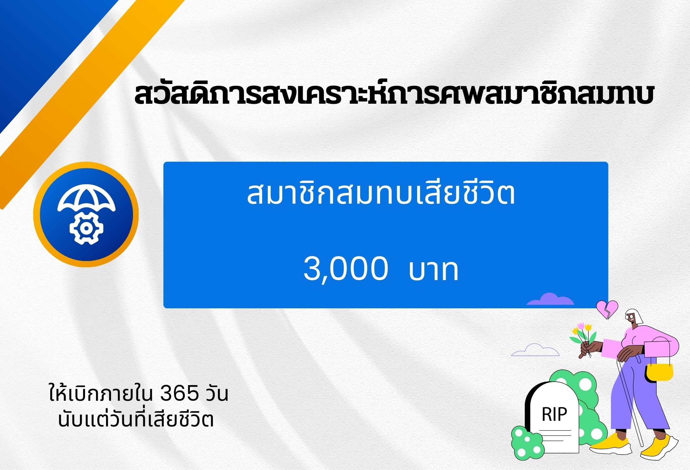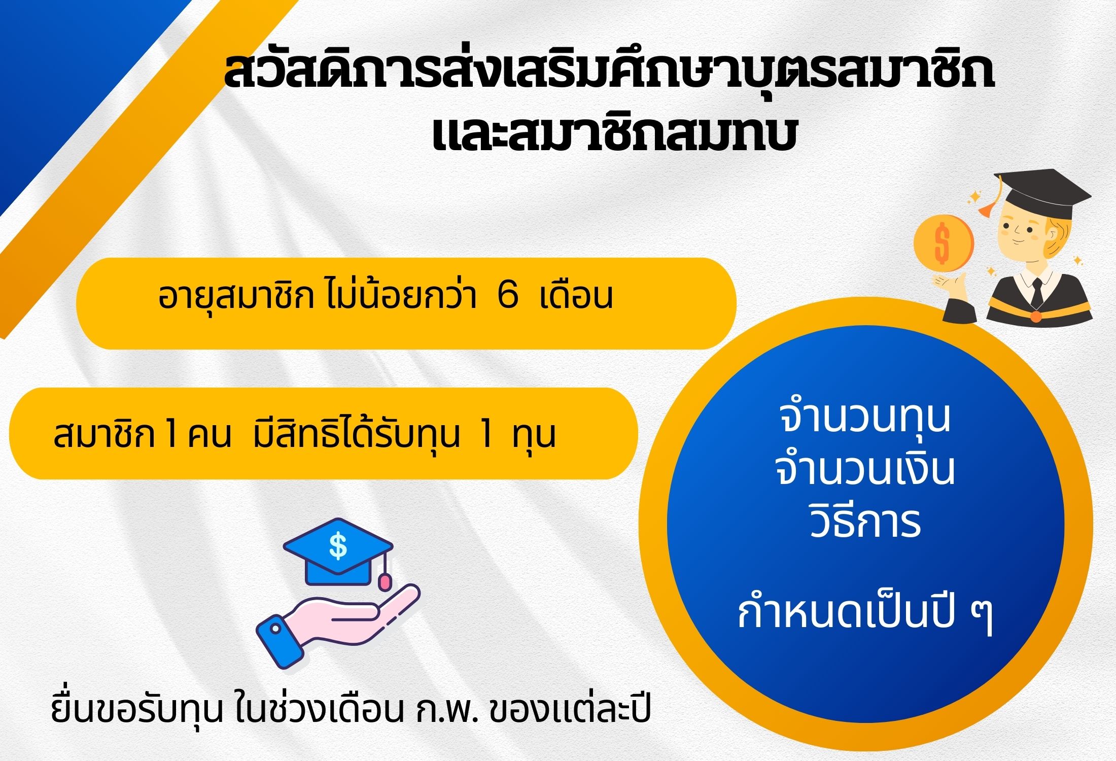 สวัสดิการสมาชิกสมทบ ทุนสวัสดิการและการสงเคราะห์ตามสมควรแก่สมาชิกและครอบครัว พ.ศ. 2568(ระเบียบ)1. สวัสดิการสงเคราะห์การศพสมาชิกสมทบ2. สวัสดิการส่งเสริมการศึกษาบุตรของสมาชิกและสมาชิกสมทบ